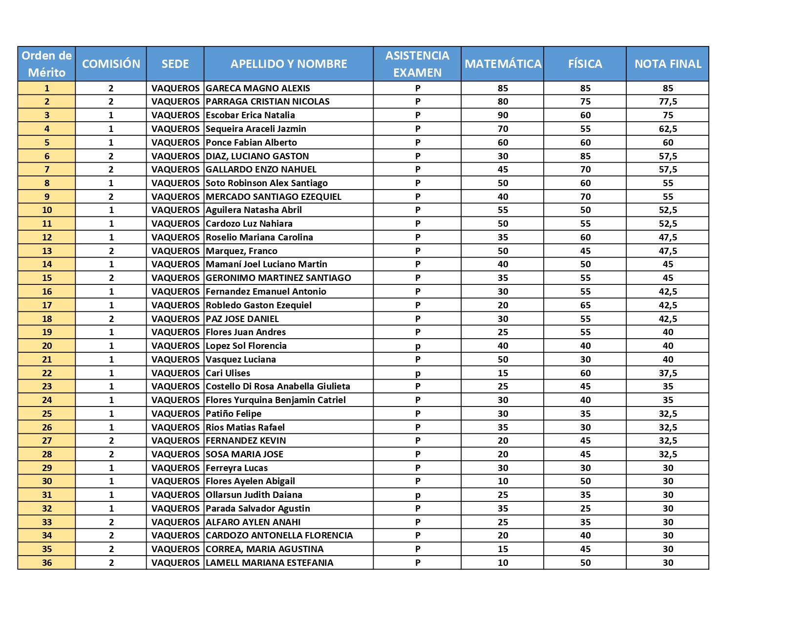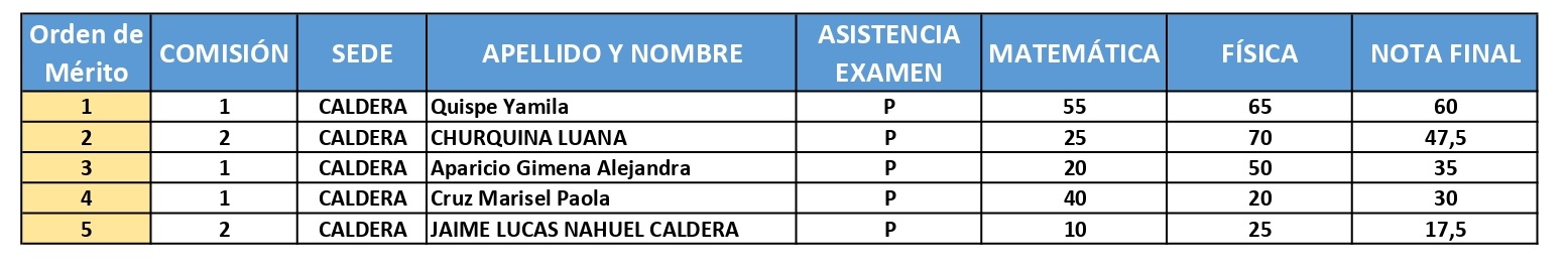Los postulantes que rindieron para la sede de Vaqueros y que terminaron entre los puestos 49 y 90 tendrán, si resultara de su interés, la posibilidad de ingresar a cursar la carrera en la sede de La Caldera.