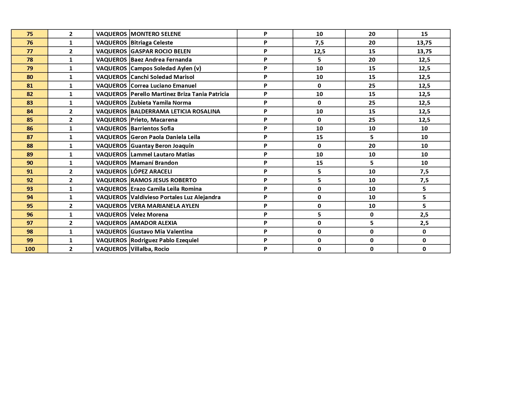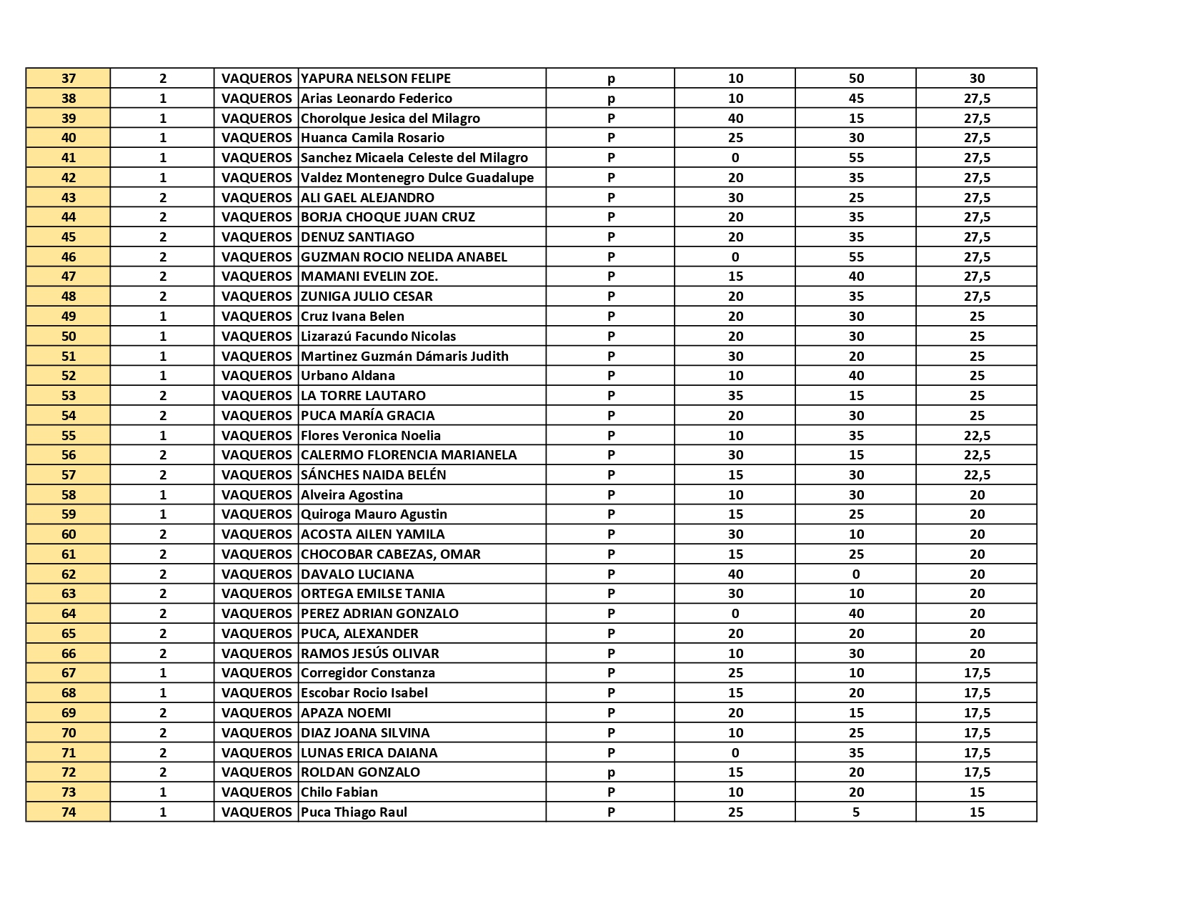 – Sede Vaqueros: ingresan del número 1 al 48 inclusive